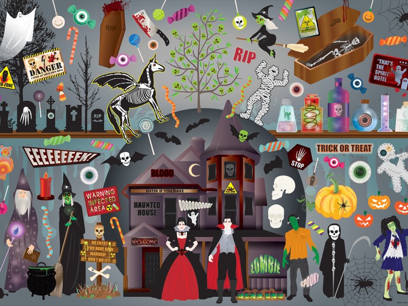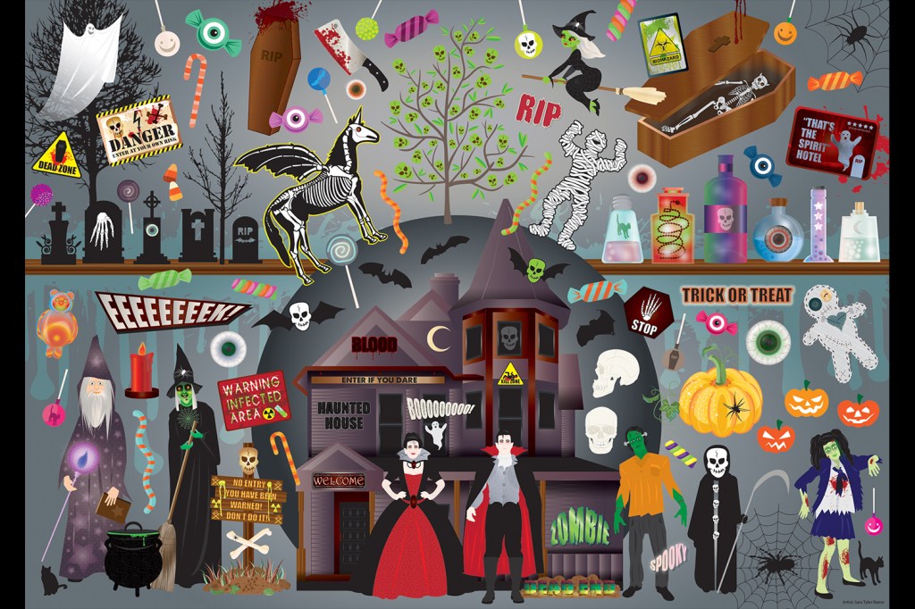 Halloween themed illustration created using Adobe Illustrator – this artwork has been printed on a luxury tea towel which you can purchase from my UK Etsy shop: https://www.etsy.com/uk/shop/stuffonstuffUK