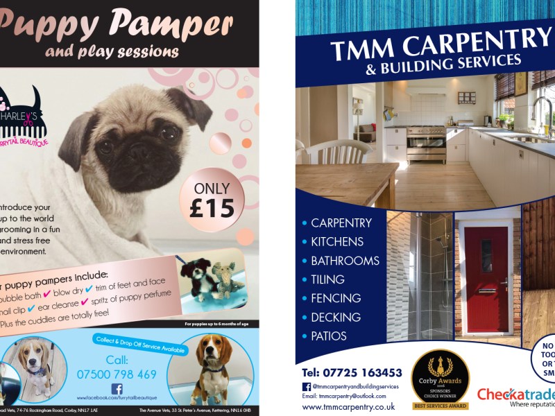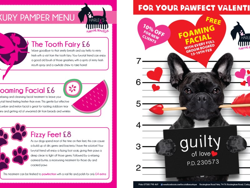 Harleys A1 Posters – Menu & Valentines Flyers, Posters & Adverts A1 luxury pamper menu poster and Valentines Day offer for Harley’s dog grooming salons