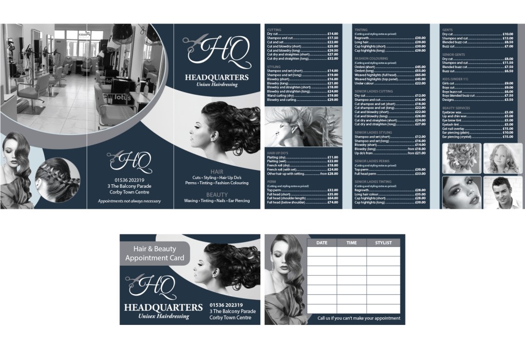 HQ Trifold and Appointment card Leaflets & Trifolds, Stationery Trifold salon menu and appointment card for HQ: